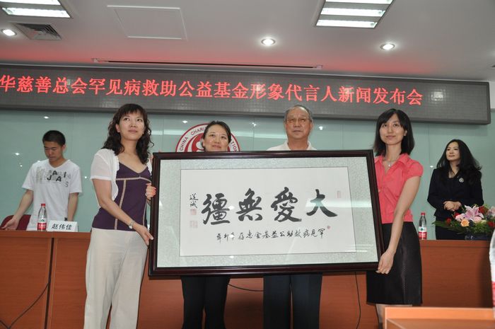 在发布会上,中华慈善总会张道诚副会长发表致辞,并感谢罕见病救助办公室的工作人员辛勤的工作,为鼓励该项目的工作人员,中华慈善总会张道诚副会长将自己所做的书法作品《大爱无疆》赠送给罕见病救助办公室工作人员,并希望她们向这幅书法的涵义一样,把小爱化成大爱,不分地域界限,再接再厉募集到更多的公益基金,用来帮助罕见病患者。